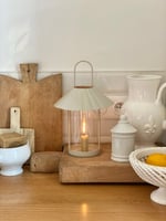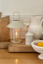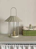 Lanterne en métal grège et verre avec poignée pour faciliter le déplacement.