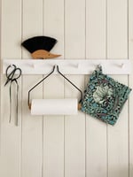 Un porte-papier ménager en chêne huilé et métal.